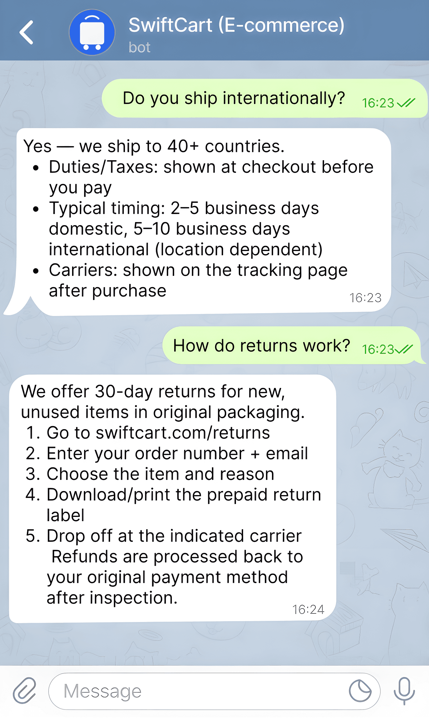 Stop repeating the same answers all day. Vispae handles repetitive customer questions — shipping times, pricing, booking, returns, product info, complaints and more — so your team can focus on work that actually grows the business.